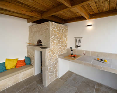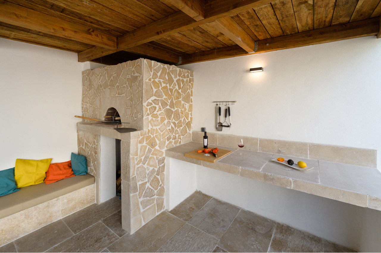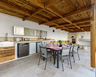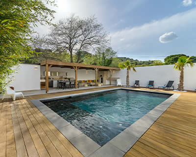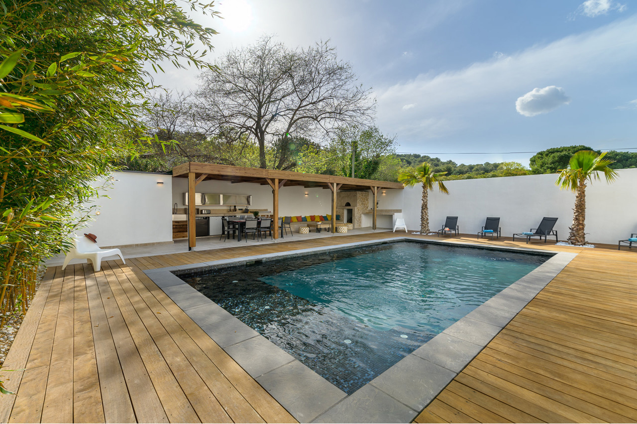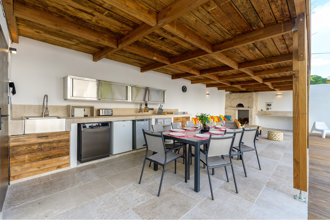 Une cuisine avec ilot central toute équipée et une cuisine d’été proche de la piscine.